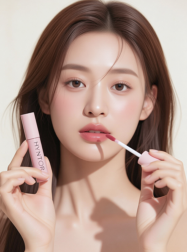 将图2中的口红替换为图1中的口红,模特保持自然手持姿态将口红托举于身前嘴唇区域,浅灰色背景,柔焦侧光强化人物妆容的清透感与口红的质感层次,整体营造高级简约的美妆产品人像展示氛围详情