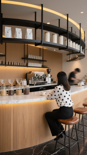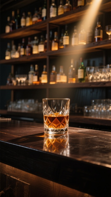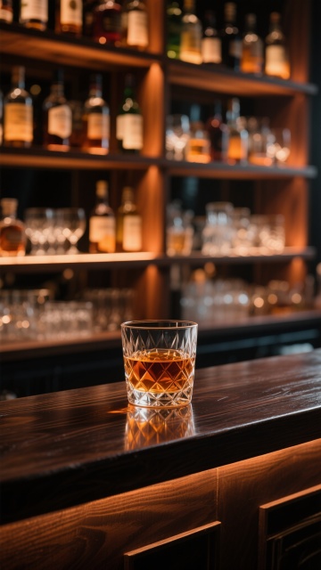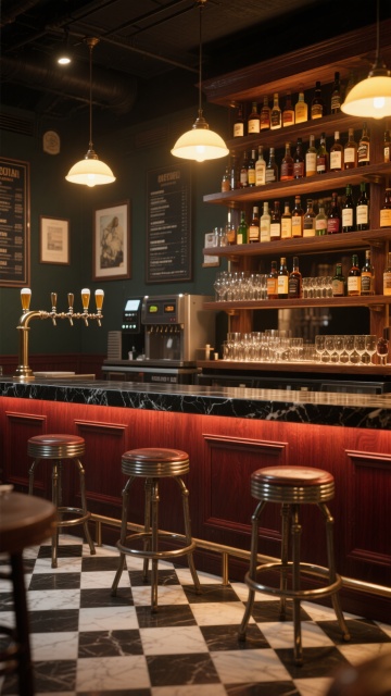 现代高端酒吧内部空间设计,深棕色木质吧台搭配黑色金属框架,台面下方及层架边缘有温暖的黄色灯带勾勒轮廓,后方多层酒架上整齐排列各式酒瓶,天花板悬挂线性吊灯并带有格栅状透光设计,吧台前四个深灰色高脚凳,左侧大面积落地窗引入室外绿植景观,地面铺设几何图案拼花地砖,整体风格奢华而沉稳,光线变换为柔和的暖橙色漫射光,营造温馨而富有格调的饮酒氛围,细节精致,材质质感真实,空间层次分明,光影过渡自然。