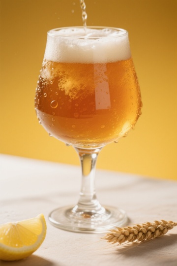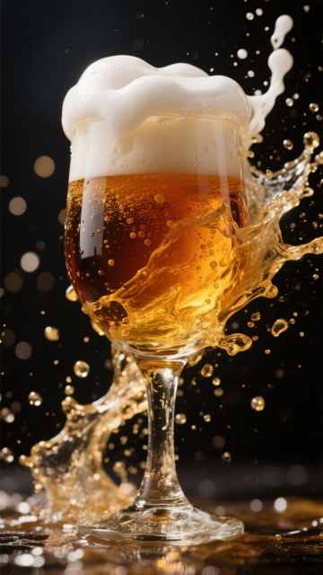 超写实摄影风格,一杯装满深琥珀色啤酒的高脚玻璃杯,顶部覆盖着厚实细腻的白色泡沫,啤酒从杯中剧烈飞溅而出,形成动感十足的金色水花和无数细小的酒滴,背景为深邃的黑色,点缀着散景光斑营造出梦幻氛围,整体光影对比强烈,强调液体的透明质感与泡沫的绵密肌理,水花四溅的动态瞬间被清晰捕捉,充满活力与清凉感。