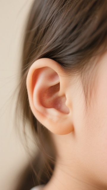 超写实主义人像摄影,耳朵特写,30岁左右女性,清晰展示耳朵的解剖结构,包括耳轮、对耳轮、耳屏、耳垂等细节,自然健康的浅棕色皮肤,细腻光滑的肤质,柔和的高光与阴影过渡,突显皮肤质感,深棕色的浓密长发自然垂落,发丝纹理清晰可见,从头部侧面延伸至耳朵上方,柔和的侧光照明,光源来自左上方,营造出立体感,背景简洁模糊,突出主体,画面聚焦于耳朵及周围侧脸区域,保持与原图一致的构图比例和视角,传达出成熟女性的优雅与精致。