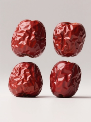 四个不同造型样式的红枣,保持超写实摄影风格,表面呈现自然褶皱纹理与高光反光,统一的深红色调,置于纯白色纯色背景上,规整排布,无任何文字、logo及水印