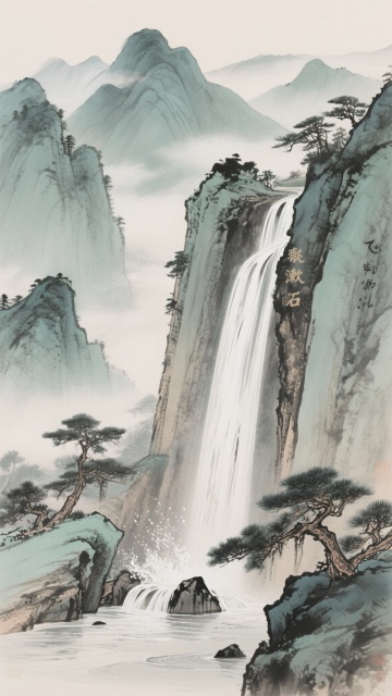 一幅极具中式韵味的水墨山水画,以淡雅的灰绿色调为主,采用传统中国水墨画的笔触技法,线条流畅自然,墨色浓淡干湿变化丰富,营造出空灵悠远的意境。画面中山峰层峦叠嶂,形态各异,或雄伟挺拔,或平缓绵延,山间云雾缭绕,似轻纱般弥漫飘荡,将山峦若隐若现地笼罩其中,增添了神秘朦胧之感。近景处几棵苍劲的松树点缀在山脚下,枝叶舒展,姿态古朴,凸显出中式山水的典型元素。整体构图遵循“高远、深远、平远”的传统山水画法则,留白恰到好处,给人以无限的想象空间,尽显东方美学的独特韵味与雅致格调。