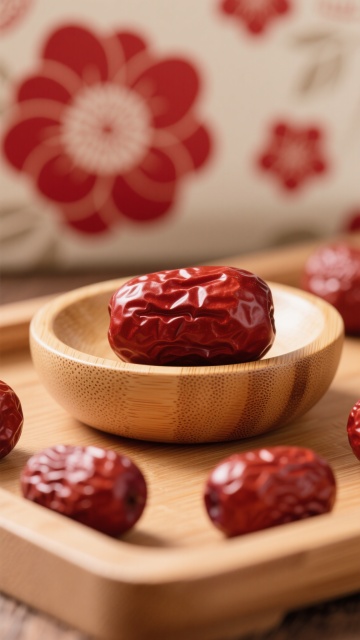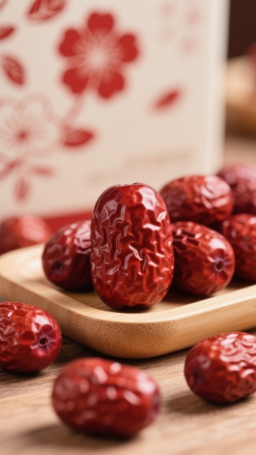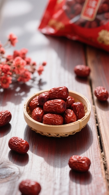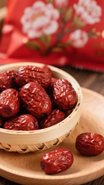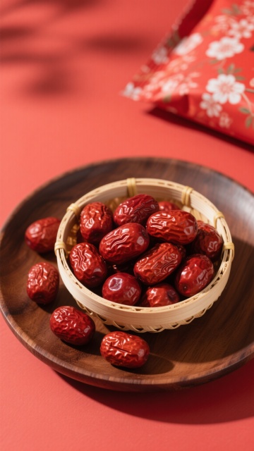 超写实摄影,浅色竹编小篮盛深红色干红枣,篮内外散几颗红枣,清晰木质托盘纹理,背景模糊红花朵包装,柔和光线显红枣微皱表皮与饱满形态,暖红主色调配自然木纹,干净质朴温馨背景素材用提示词。