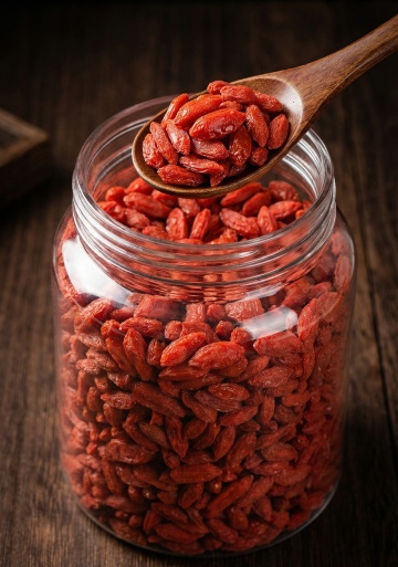 特写镜头下,新鲜饱满的枸杞果实,深红色的果实在柔和的自然光线下呈现出细腻的纹理和光泽,部分枸杞散落在古朴的木质托盘上,木质托盘边缘有自然的木纹和轻微的磨损痕迹,背景为模糊的暖色调木质元素和深色布料,营造出温馨自然的氛围,枸杞果实颗粒饱满,形态完整,表面光滑,光影效果柔和,突出枸杞的质感和新鲜感,整体画面构图平衡,色彩和谐,具有浓厚的自然健康风格。