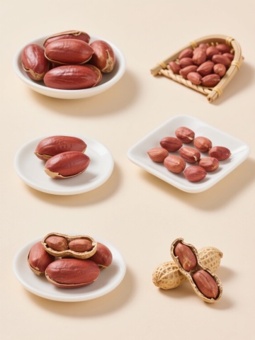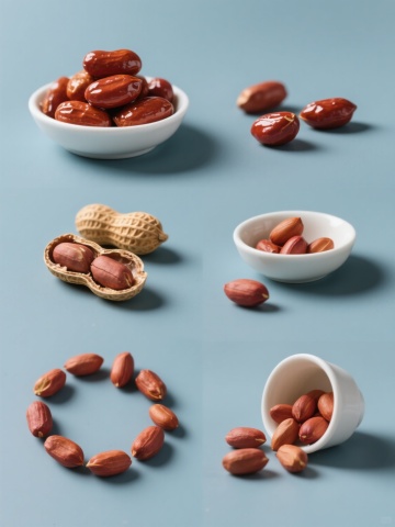 六个不同造型的卤制花生系列素材集合,纯色背景,保持超写实摄影风格,棕红色花生,油亮光泽,清晰纹理,高光阴影自然。第一个造型:整盘花生,白色浅口碗装,花生饱满堆叠;第二个造型:三颗花生特写,散落排布;第三个造型:剥开一半的花生,露出果仁;第四个造型:花生与空碗组合,几颗花生在碗旁;第五个造型:花生排列成圆形;第六个造型:花生从碗中溢出几颗,规整排布在画面中,每个造型独立成组,整体构图平衡,突出花生质感与不同形态。