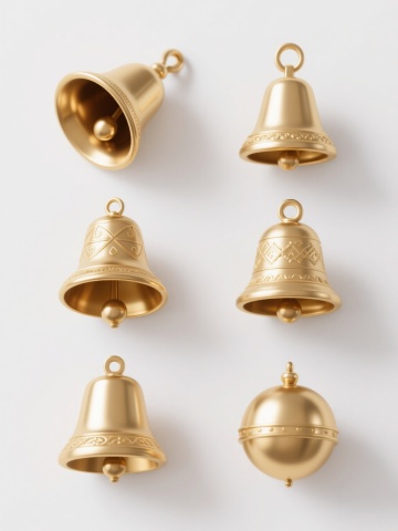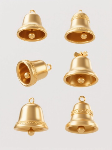 六个不同样式、不同元素、不同配色的3D卡通铃铛,保持圆润光滑的3D模型质感,明亮的渐变色彩,柔和的高光和自然阴影,每个铃铛具有独特设计(如不同形状的铃铛口、装饰纹路、悬挂元素或摇动轨迹线),整齐排列在纯白色背景上,风格统一为可爱卡通通风,视觉层次清晰,构图均衡。