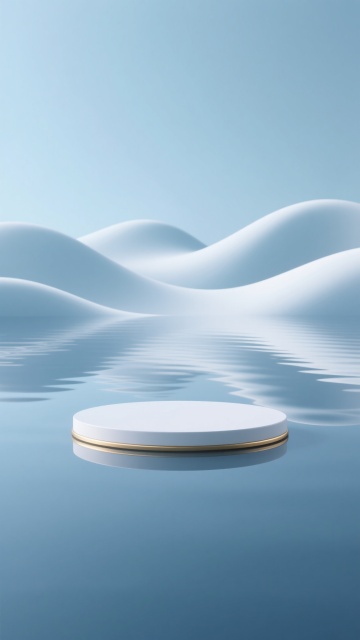 极简主义3D渲染背景,整体采用纯净的浅灰白色调,柔和均匀的光源从顶部照射,营造出明亮通透的氛围。画面底部是光滑如镜的水面,清晰倒映出上方物体的轮廓,水面上有细微的水平波纹纹理。中央位置有一个圆形的白色展示台,台面边缘有一圈精致的金色细边,台体呈现出轻微的立体感和细腻的哑光质感。背景远处是连绵起伏的白色波浪形态,线条流畅柔和,与前景的展示台形成呼应,整体构图简洁大气,留白充足,具有强烈的现代设计感和高级感。