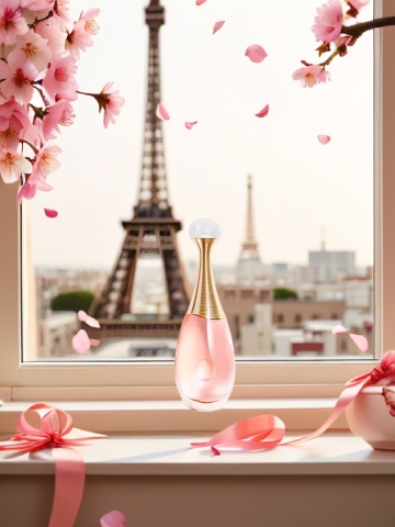梦幻唯美风,浪漫樱花飘落,香水瓶轻拟物设计,超现实主义玻璃质感,甜美节日氛围。