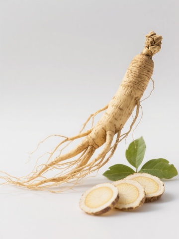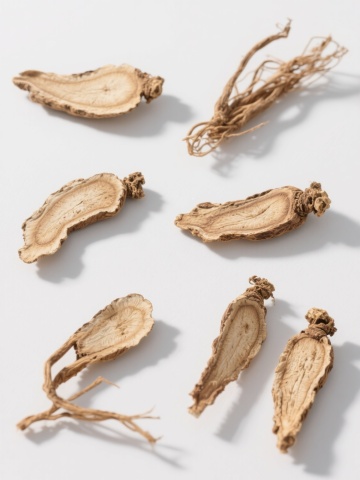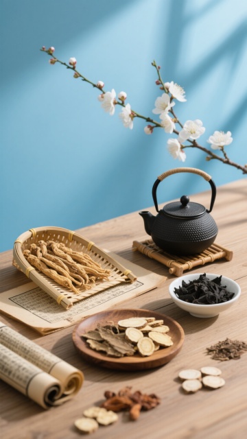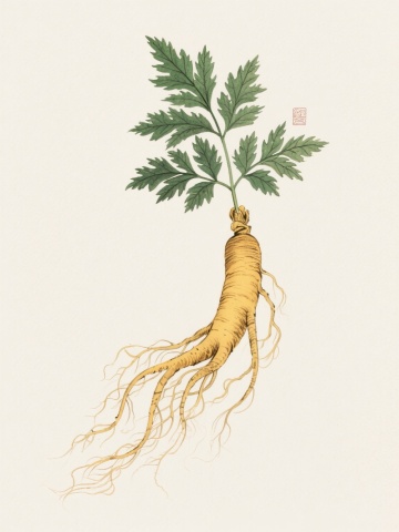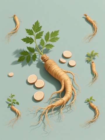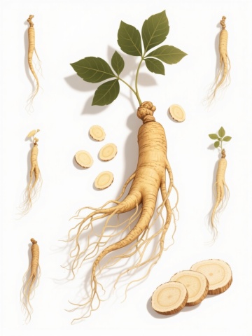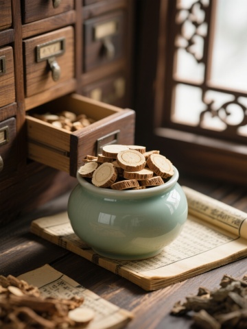 高清写实摄影风格,温暖的棕黄色调为主色调,柔和的侧逆光从画面左侧照射,营造古朴自然的氛围。画面主体是一株完整的、根部带须的人参,放置在一块带有年轮纹理的圆形木墩上,木墩旁有一截天然原木。人参右侧摆放着几片切片的黄色药材,旁边散落着一些干燥的草本植物。前景是一张泛黄的、写有古老文字的纸张,纸上也放着少量草本药材。背景为云雾缭绕的青山远景,山体轮廓朦胧。整体构图采用三分法,主体清晰突出,背景虚化处理,光线柔和地勾勒出人参和药材的质感,营造出传统中药的自然、古朴与珍贵感,画面信息传达清晰,具有浓厚的东方传统医药文化气息。