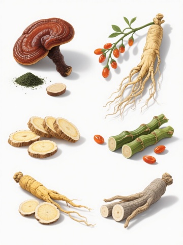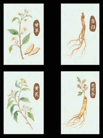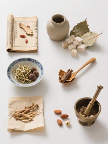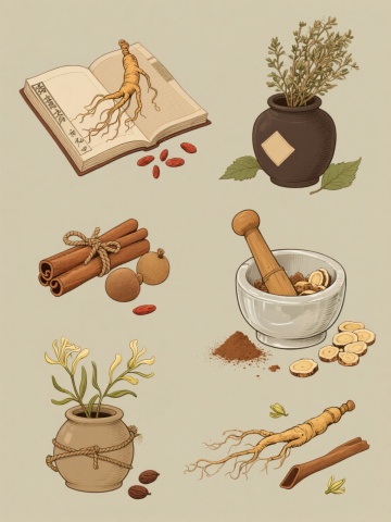 六个系列的中药元素集合,每个元素都采用复古手绘插画风格,以米色为纯色背景,包含以下不同内容:1. 左侧:一本打开的古旧草药书,书页上放着几支人参和灵芝,旁边散落着几颗黄色的药丸;右侧:一个棕色陶罐,里面插着几支干枯的艾草,罐口系着麻绳。2. 左侧:一个竹编簸箕,里面装满了晒干的金银花和菊花,旁边放着一个小铜秤;右侧:一张卷起来的草药图谱,用红绳系着,旁边散落着几片银杏叶。3. 左侧:一个青花瓷碗,碗里盛着当归和枸杞,旁边放着一把小银勺;右侧:一棵手绘的草药植株,根部带着泥土,叶片翠绿,旁边有几颗红色的果实。4. 左侧:一个木质药柜抽屉,抽屉上贴着“川芎”的标签,里面露出几支川芎根茎;右侧:一个玻璃药瓶,里面装着黑色的药膏,瓶口用软木塞封着,旁边放着一支小毛刷。5. 左侧:一张手绘的人体经络图,图上用红线标出穴位,旁边放着几根银针;右侧:一个小竹篮,里面装着薄荷和藿香,篮子把手处系着蓝色布条。6. 左侧:一个铜制药炉,炉口冒着热气,旁边放着一把蒲扇;右侧:一张写着草药配方的泛黄纸张,纸上放着几支甘草和黄芪,旁边散落着几颗褐色的种子。所有元素排布规整,线条细腻,色彩以棕色、绿色、红色为主,呈现出古朴自然的氛围,无任何文字、LOGO、电话地址及二维码。