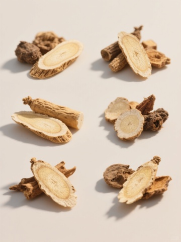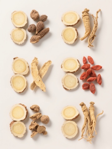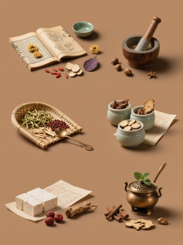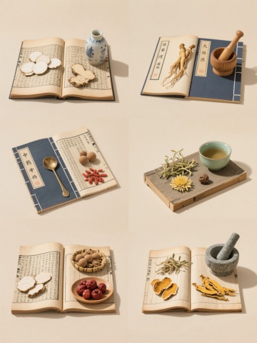 纯色背景下,保持原中药素材写实摄影风格,以传统中医药为主题,生成六个完全不同元素内容的系列素材集合,规整排布。每个素材单元均采用高清写实摄影手法,展现不同种类的中药实物,包括但不限于:1. 一本翻开的古老线装中医药典籍,书页上散落着干制的菊花、枸杞和几片当归切片,旁边放置一个小巧的青瓷药碗;2. 一个古朴的木质药碾子,碾槽内盛放着待研磨的苍术,旁边散落几颗饱满的连翘果实和几片紫苏叶;3. 一组三个不同规格的陶瓷药罐,罐口分别露出丹参、黄芪和党参的断面,罐旁摆放一张折叠的处方笺;4. 一个竹编簸箕内整齐码放着金银花、麦冬和五味子,簸箕边缘斜搭着一把铜质药匙;5. 一块切割整齐的茯苓块,旁边摆放着整支的川芎根茎和几串干山楂,背景是半张摊开的中医药图谱;6. 一个铜制药炉,炉旁散落着桂枝、陈皮和干姜,炉盖上放着一小束薄荷。所有元素保持统一的暖色调光影,清晰的纹理细节,柔和的阴影过渡,整体呈现古朴自然的中医药文化氛围,各单元构图协调一致,形成系列感。