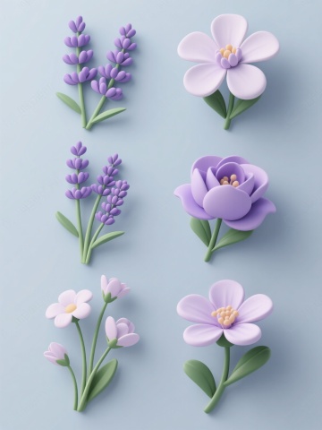 六个规整排布的3D立体花朵素材,保持简约现代风格,包含薰衣草及其他不同品种花卉,每朵花都具有平滑的3D渐变质感,花瓣层次分明,绿色花茎和叶片细节清晰,整体造型精致,放置于纯色背景上,无任何文字、logo或水印。