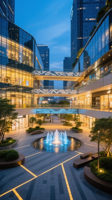 现代未来主义风格商场外观,黄昏至夜晚过渡时分,深蓝色渐变天空,建筑主体为玻璃幕墙与金属结构组合,几何切割感强的多层建筑,连接两栋主楼的半透明天桥点缀彩色抽象图案,地面设有圆形喷泉广场,灯光从建筑内部透出形成温暖光晕,周围点缀低矮绿植与座椅,整体呈现简洁大气的都市商业氛围,光影对比鲜明,细节质感清晰,现代感十足的商业建筑群。
