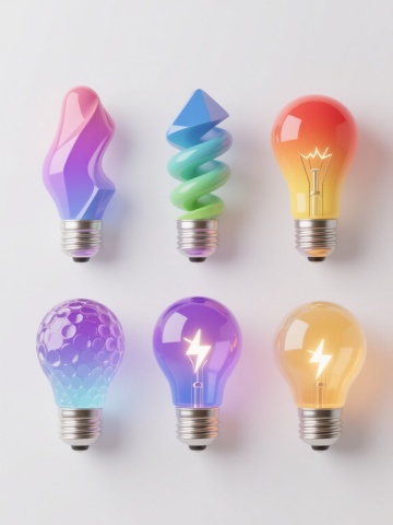 一组六个具有现代3D渐变质感的创意灯泡设计素材集合,每个灯泡造型独特(如流线型、棱角切割型、复古螺旋型、几何拼接型、气泡纹理型、简约球形),均保持通透玻璃材质与金属螺纹底座,分别采用不同的渐变配色方案(如粉紫渐变、蓝绿渐变、橙黄渐变、红绿渐变、紫蓝渐变、黄橙渐变),灯泡内部有发光的星形或闪电状光源效果,所有灯泡在纯白色纯色背景上以2x3网格形式规整排布,整体风格统一,光影柔和,高光细节清晰,适合作为创意设计元素使用。