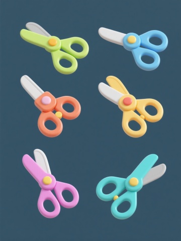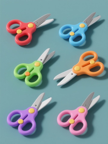 一套6个不同造型的儿童安全剪刀系列素材集合,每个剪刀均保持3D立体写实风格,圆润可爱的设计语言,金属刀刃呈现光滑的银色质感并带有细微反光,彩色塑料手柄(分别为红色、蓝色、绿色、橙色、紫色、粉色),剪刀整体有轻微的阴影以增强立体感,所有剪刀规整地排列在纯色背景上,画面整体色彩明快活泼,构图均衡对称,适合作为儿童用品相关的系列图标或素材使用。