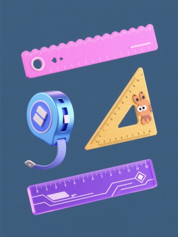3D风格的四个不同造型尺子素材集合,纯色背景,规整排布。包含一个带有波浪形边缘和圆形刻度的粉色塑料直尺,一个带有几何镂空图案和方形刻度的蓝色金属卷尺,一个带有卡通动物图案和三角形刻度的黄色木质量角器,以及一个带有未来科技感线条和菱形刻度的紫色亚克力标尺。每个尺子都有清晰的刻度标记和独特的材质质感,整体色彩明快鲜艳,布局整齐有序,适合作为设计素材使用。