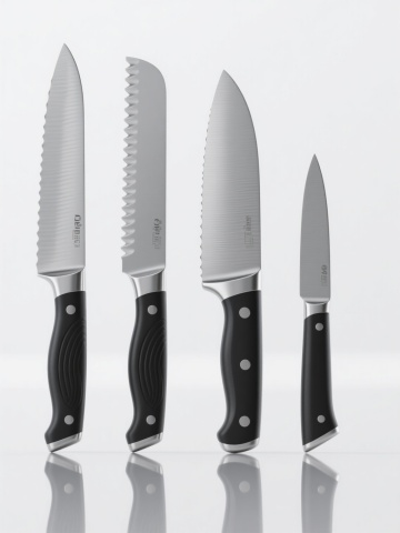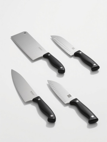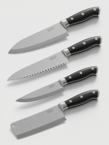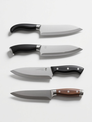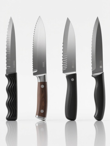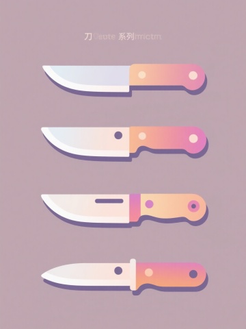 一套由四把造型完全不同的卡通风格刀具组成的系列素材集合,规整排布在纯色背景上。每把刀都采用与原图一致的平面设计风格,具有平滑的线条、简洁的形状、柔和的渐变色彩和轻微的阴影效果。第一把是带有红色木质刀柄和蓝色刀刃的厨师刀,第二把是橙色刀柄的弯形水果刀,第三把是绿色刀刃的锯齿状面包刀,第四把是紫色刀柄的细长雕刻刀,所有刀具均匀排列,保持统一的艺术风格和视觉语言。