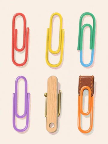 手绘风格的回形针造型素材,采用彩色铅笔笔触质感,线条略带随意感和手工绘制的温暖感,六个不同配色(如红色、黄色、绿色、蓝色、紫色、橙色)、不同样式(如标准型、宽型、迷你型、弧形、带装饰纹、扁平型)、不同材质(金属光泽、磨砂质感、木质纹理、塑料透明感、皮质包裹、荧光材质)的回形针,在浅色背景上呈上下两行整齐对齐排列,每个回形针保留手绘的线条特征和轻微的阴影表现,整体保持一致的手绘插画风格和简洁明快的视觉效果。