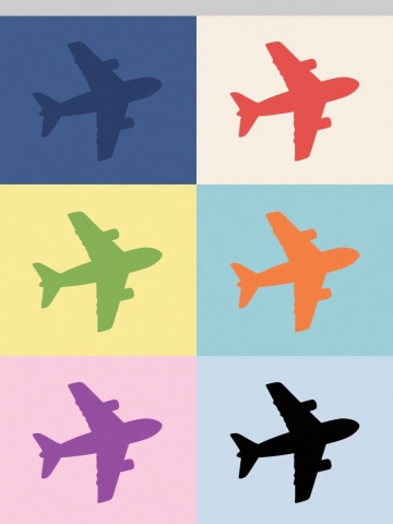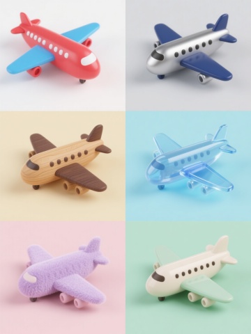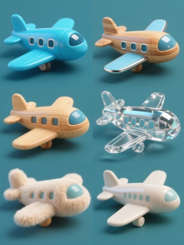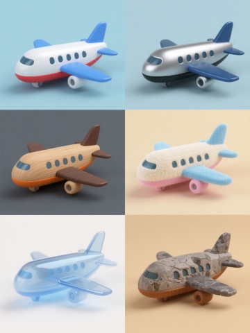 六个完全相同造型的卡通风格客机模型,每个飞机采用不同材质并配有专属纯色背景,整体呈规整的2x3网格排布。第一个飞机为光滑塑料材质,亮红色机身搭配天蓝色机翼,置于纯白色背景上;第二个飞机为磨砂金属材质,银灰色机身搭配深蓝色机翼,置于浅灰色背景上;第三个飞机为木质纹理材质,浅棕色机身搭配深棕色机翼,置于米黄色背景上;第四个飞机为透明玻璃材质,淡蓝色机身搭配透明蓝色机翼,置于浅蓝色背景上;第五个飞机为毛绒材质,粉色机身搭配浅紫色机翼,置于浅粉色背景上;第六个飞机为陶瓷材质,米白色机身搭配浅绿色机翼,置于淡绿色背景上。所有飞机保持相同的卡通造型、比例和姿态,仅在材质和对应背景颜色上有所区分,整体画面简洁明快,设计感强,适合作为系列素材使用。