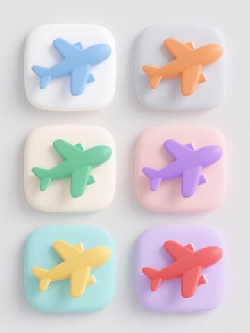 六个软3D风格飞机图标系列,保持相同的飞机剪影形态与简约结构,每个图标拥有独立的纯色背景和主体配色:1. 淡蓝色背景配深蓝色飞机,2. 浅粉色背景配玫红色飞机,3. 嫩黄色背景配橙色飞机,4. 薄荷绿背景配深绿色飞机,5. 浅紫色背景配靛蓝色飞机,6. 浅灰色背景配黑色飞机,所有图标呈2x3网格规整排布,整体视觉统一且色彩鲜明。