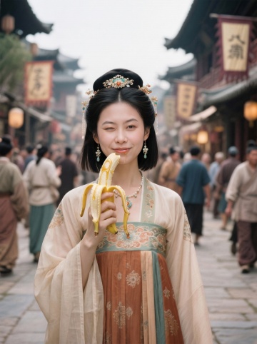 女生正脸看镜头,穿上唐代服饰,贵女打扮,站在唐代繁华的街上,身后是来来往往的唐代百姓,景深效果