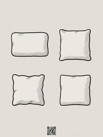 纯黑色线条手绘风格的四个不同形状枕头图案,以2x2网格形式规整排布在纯色背景上,枕头边缘线条流畅自然,带有轻微的阴影表现立体感,整体画面简洁干净,无任何文字、水印及多余装饰元素。
