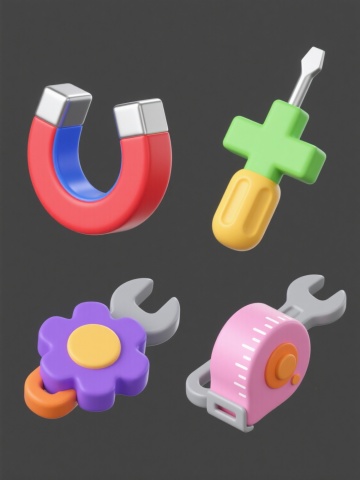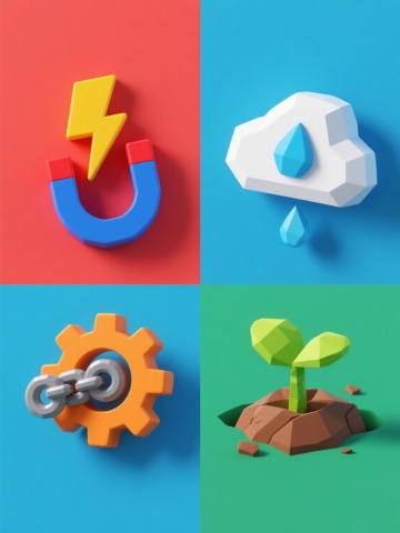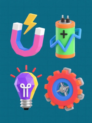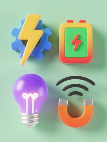 4个同系列3D立体图标规整排列在纯色背景上,保持简约现代的低多边形风格,每个图标均采用渐变色彩和光滑材质,具有清晰的高光和柔和阴影,第一个为蓝色与粉色渐变的U型磁铁及黄色闪电,第二个为绿色与橙色渐变的齿轮组及紫色能量环,第三个为红色与青色渐变的灯泡及白色光束,第四个为紫色与黄色渐变的电池及绿色电量指示,整体构图平衡对称,色彩明快协调,符合科技感主题的图标设计。