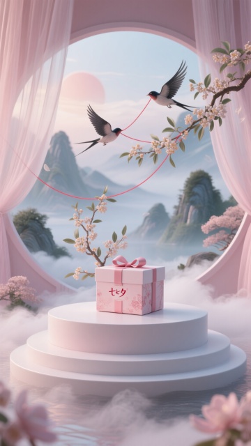 梦幻中式风格,软3D风超现实主义设计,七夕节浪漫场景。