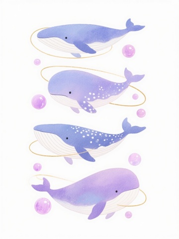 4个不同品种、不同外观的鲸鱼,白色背景,排列整齐,鲸鱼身体呈现半透明渐变质感,内部有星空般的蓝色和紫色闪光点,身体周围有流动的透明光带和飞溅的粒子效果,整体风格梦幻唯美,具有数字艺术的平滑过渡和细腻的光影表现。
