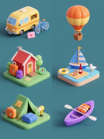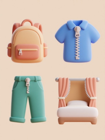 一系列4个商城系列素材,每个素材均为3D立体风格,纯色背景,规整排布。第一个素材:粉色购物篮装满彩色美妆产品,包括口红、香水、眼影盘和化妆刷,周围散落着粉色蝴蝶结和美妆蛋;第二个素材:蓝色手提袋中露出各式数码产品,如智能手机、无线耳机、平板电脑和智能手表,旁边有蓝色的Wi-Fi符号和电池图标;第三个素材:绿色冰箱门打开,里面塞满新鲜蔬果,有草莓、胡萝卜、西兰花和牛奶盒,周围飘着绿色的叶子和水滴;第四个素材:橙色行李箱内装满时尚服饰,包括连衣裙、太阳镜、皮鞋和帽子,旁边有橙色的衣架和尺码标签。所有元素均保持圆润可爱的3D建模风格,色彩明快鲜艳,光影柔和,具有统一的商城促销氛围。