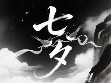 梦幻中式插画风,水墨大字“七夕”,双燕衔丝,星辉闪烁,浪漫节日氛围。
