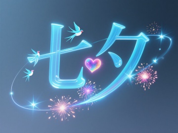 “七夕”艺术字体,融入牛郎织女鹊桥相会的剪影,字体线条如丝带般柔美飘逸,搭配渐变的粉紫色调,背景点缀闪烁的星辰和漂浮的云朵,整体风格典雅浪漫,充满传统节日氛围。