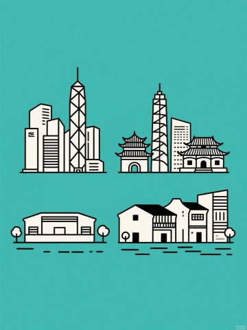 一套四个规整排布的城市建筑插画系列,每个插画均采用精细的单色线条手绘风格,背景为纯色,保持一致的线条粗细和阴影表现手法。第一个插画以蓝色线条绘制香港标志性建筑,包括中银大厦和香港会议展览中心;第二个以绿色线条呈现广东特色骑楼建筑;第三个用红色线条描绘北京故宫太和殿;第四个用紫色线条展现浙江水乡的乌篷船与白墙黛瓦建筑。所有插画元素清晰,轮廓分明,保持相同的视觉重量和构图平衡,形成统一协调的系列感。