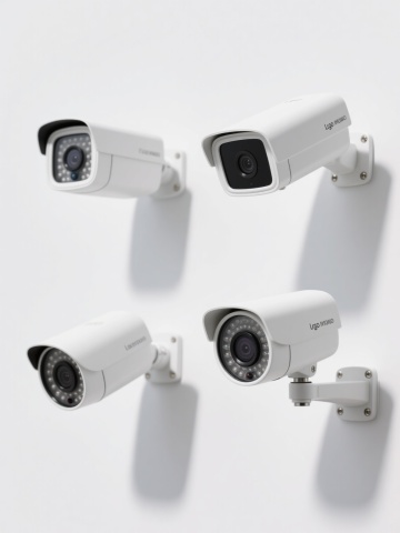 4个不同造型样式的白色监控摄像头,分别展现不同的外观设计和安装角度,高清晰度3D渲染,光滑的塑料质感,细腻的金属螺丝细节,镜头玻璃呈现黑色反光效果,红外灯阵列清晰可见,每个摄像头独立置于纯净的白色纯色背景上,整体呈规整的网格排布,写实产品摄影风格,专业质感,无文字、无logo、无水印、无装饰元素,清晰的产品细节,精确的光影表现,立体感强,工业设计感,干净简洁的构图,物体边缘锐利分明,材质对比明显,高光与阴影过渡自然。