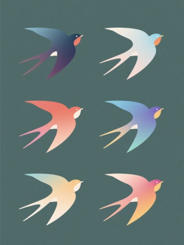 极简现代风格插画,纯色背景,六个规整排布的素材单元,每个单元包含一只不同颜色、不同动态的燕子,燕子造型保留原插画的简约线条感、黑白主色调及红色喙部特征,动态包括展翅、滑翔、栖息等多样姿态,整体构图平衡对称,线条流畅明快,色彩纯净,无文字、无logo、无水印。