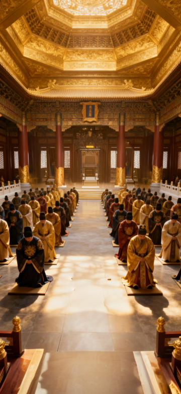 宫廷盛宴之上,灯火辉煌璀璨如昼。在众人的目光聚焦之处,缓缓走来一位女子。她身穿华丽的绛紫色宫装,衣料上用金线勾勒出复杂而精致的凤穿牡丹图案,尽显尊贵之气。外罩一层薄如蝉翼的鲛绡纱衣,若隐若现间更增添了几分神秘的美感。高耸的发髻上插满了各种珍稀珠宝制成的簪钗,其中一支凤凰形状的步摇最为夺目,随着她的走动轻轻摇曳,发出清脆悦耳的声音。 她的容貌堪称绝色,冷峻的脸庞如同冰雕玉琢而成,线条优美却不失凌厉之