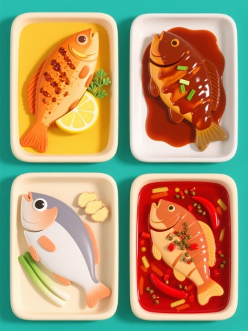 三个不同配料烤鱼的系列素材集合,明亮卡通插画风格,纯色背景,规整排布在同一画面中。每个烤鱼均保持相同的写实细节:完整的烤鱼形态、金黄焦脆的鱼皮、清晰的刀痕纹理、黑色烤架托盘,以及周围散落的香料颗粒。第一个烤鱼搭配大量新鲜柠檬片,背景为清新的浅蓝色;第二个烤鱼点缀翠绿香菜叶,背景为活力橙黄色;第三个烤鱼铺满鲜红辣椒段,背景为热情的红色。每个元素都具有细腻的光影过渡、鲜明的色彩对比和圆润的轮廓线条,整体画面协调统一,信息传达直观清晰。