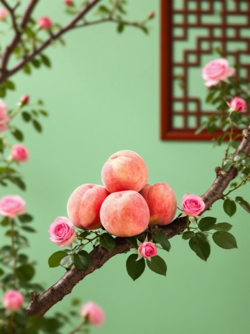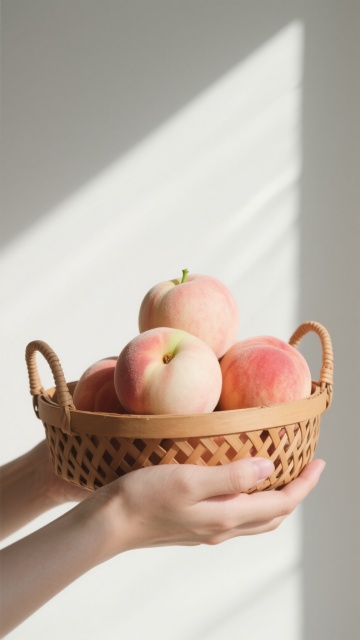 极简构图,一只纤细的手捧着浅棕色编织藤篮,盛满粉白渐变橙红的水蜜桃,果皮绒毛清晰可见,顶端浅黄绿色果蒂鲜活。背景是纯净的象牙白墙面,几缕金色阳光从右侧45度角斜射而入,在墙面投下藤篮的几何阴影,光影边界锐利分明,色调以蜜桃粉与象牙白为主导,点缀浅绿果蒂,整体画面干净通透,突出水果的自然肌理与光线的立体塑造。