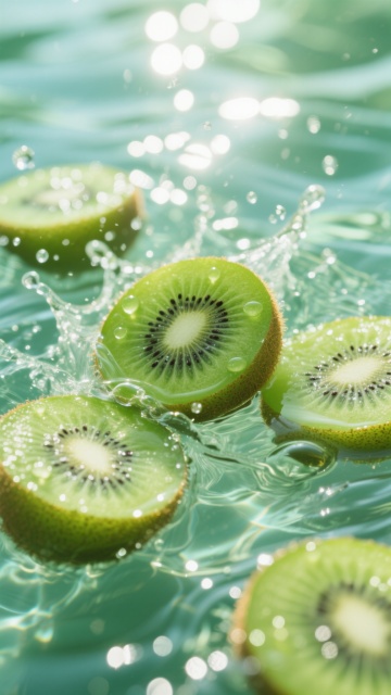 多个饱满水蜜桃悬浮在透明水花中,表面覆盖晶莹水珠,水滴四溅形成大量气泡和水纹,整体采用清新的粉绿色调,水蜜桃保持原有的圆润形态和细腻绒毛质感,光线明亮柔和,营造出清爽水润的氛围,具有高分辨率的照片级质感,光影过渡自然,画面充满动感和透明感。