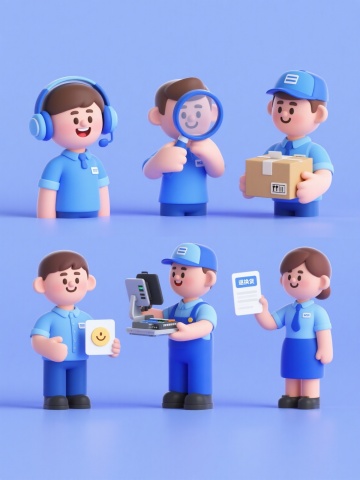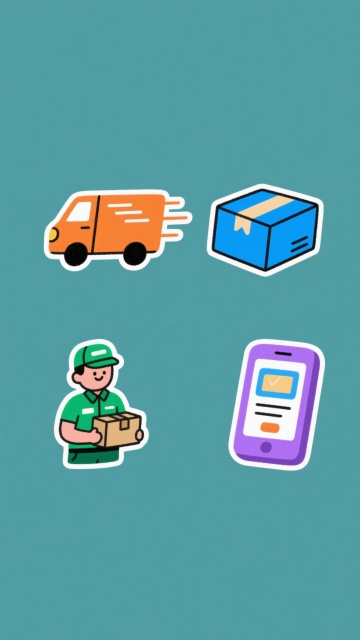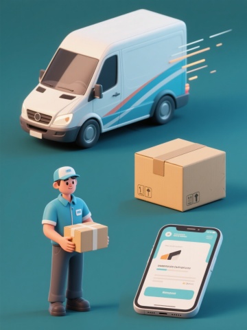 系列软3D风格快递主题素材集合,纯色背景,画面整体变换色彩,规整排布四个完全不同元素内容:第一个是带有速度线条装饰的卡通风格快递货车,车身为柔和渐变蓝色,车轮和车窗为白色,整体造型圆润可爱;第二个是堆叠的快递盒,盒子为橙色,带有白色胶带和黑色快递单,盒角有轻微阴影增强立体感;第三个是穿着绿色快递服的快递员,戴着帽子,面带微笑,手中拿着一个包裹;第四个是正在显示快递信息的智能手机,手机为紫色,屏幕亮着,显示着快递单号和物流状态,所有元素均保持统一的软3D风格,色彩明快,造型简洁,适合作为快递相关的系列宣传素材。