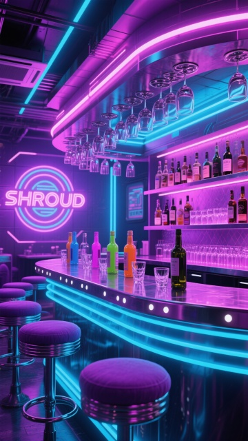 一个充满未来感的赛博朋克风格酒吧内部场景,深色调的空间中,吧台以深色金属与霓虹蓝、紫色灯带勾勒出锐利的几何轮廓,吧台上整齐排列着带有霓虹光效的酒瓶与酒杯,吧椅设计成流线型的黑色或透明材质,搭配发光底座。天花板垂下带有全息投影效果的装饰灯,墙面采用裸露的金属板与全息广告屏结合,窗外是雨夜中的城市霓虹夜景,霓虹灯光透过巨大的落地窗映照在光滑的黑色地板上,形成迷离的光影反射,整体氛围神秘而前卫,充满科技感与未来都市的夜晚魅力。
