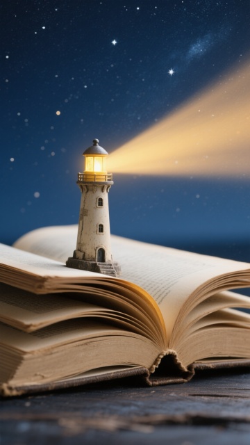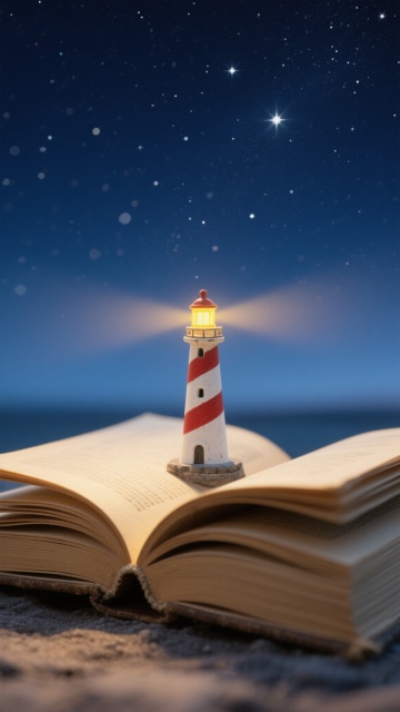 梦幻水彩插画,超现实主义风格,灯塔与书本交织,照亮知识的海洋。