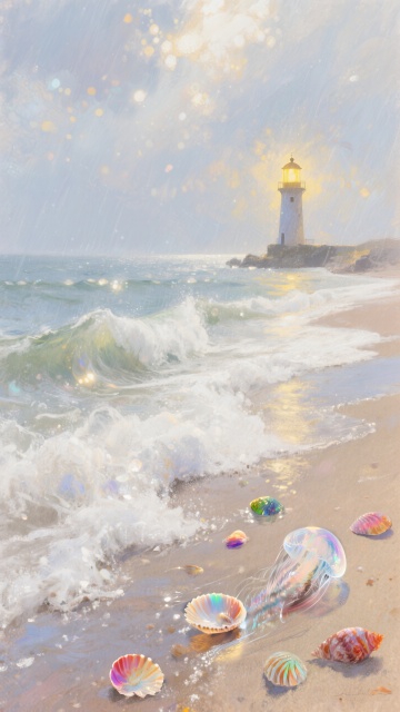 梦幻水彩插画,虚拟自然海滩,彩色贝壳与水母,灯塔光辉映衬。