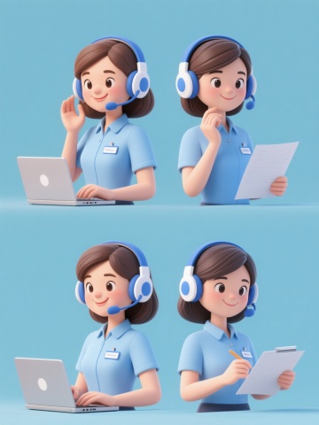 3D卡通风格客服系列插画,四位不同性别、发型、样貌的客服人员,均佩戴耳机,身着蓝色衬衫和黑色领带,面前放置笔记本电脑,每人配有黄色对话气泡,表情友好,动作各异,上下两行整齐排列,纯色背景,整体采用圆润造型,明亮色彩,平滑渐变质感,简洁清晰的视觉层级,符合客服职业特性的亲和力设计。