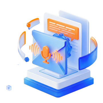3D卡通风格女性客服形象,白色背景,正面视角,中等特写构图。人物有着黑色齐肩短发,戴着蓝色圆形耳机与黑色麦克风,面带微笑,眼睛为黑色圆形,眉毛呈弧形。身穿蓝色衬衫,搭配黑色领带,右手放在打开的银白色笔记本电脑键盘上。右侧有一个黄色对话气泡,内含三个黑色圆点。整体采用低多边形3D建模,表面光滑,色彩鲜明饱和,阴影柔和,光线均匀,呈现出友好、专业、轻松的氛围,简约现代的设计风格。