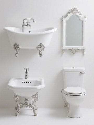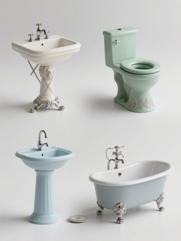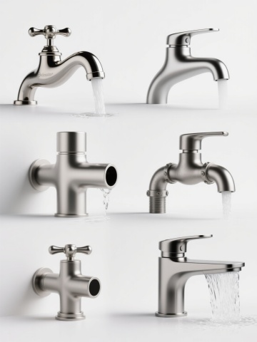 一组六个完全不同造型的水龙头系列素材集合,保持高度统一的写实3D立体风格,全部采用纯白色纯色背景,每个水龙头都展现出精湛的金属质感,表面光滑且具有强烈的反光效果,高光和阴影细节丰富,光线从斜上方照射,营造出清晰的立体感。水龙头造型包括:1. 复古双旋钮欧式水龙头,带有优雅的曲线和装饰性细节,水流呈自然弧线倾泻而下;2. 现代简约单柄水龙头,线条流畅利落,出水口设计独特,水流集中有力;3. 工业风金属管道水龙头,造型粗犷,带有明显的螺栓和管道结构,关闭状态;4. 未来感触控感应水龙头,外观简洁光滑,无明显旋钮,水流呈片状流出;5. 经典十字把手水龙头,造型方正,结构稳固,关闭状态,把手呈十字交叉;6. 创意瀑布式出水口水龙头,出水口宽阔,水流如瀑布般平缓流出。六个水龙头规整排布,形成协调的视觉系列,每个水龙头都保留了核心的水龙头元素特征,同时在整体造型、细节设计和水流状态上各具特色,整体设计具有强烈的产品展示感,信息传达清晰,视觉层级分明。