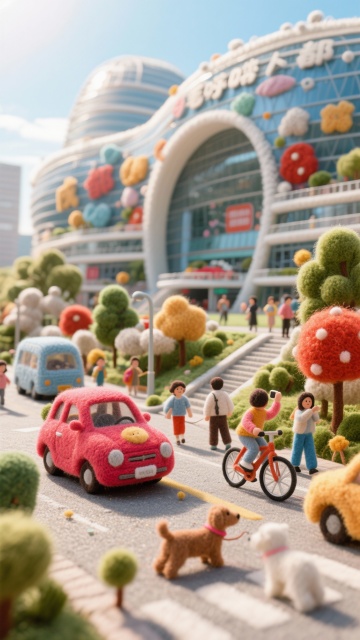 软3D风微缩艺术场景,毛发生长质感的卡通城市,梦幻清新中透着温馨趣味,萌趣人物与萌宠共绘可爱日常。