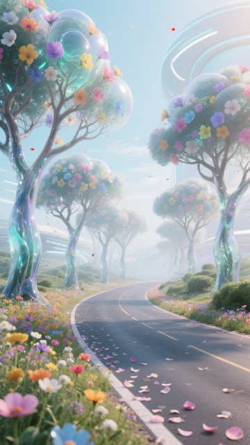 梦幻3D虚拟自然,清新柔和的超现实主义风格,花与泡泡点缀湖面,山峦朦胧。