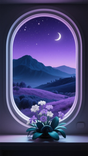 3D渲染风格,从圆形舷窗向外眺望的视角,窗外是深紫色渐变的夜空,点缀着闪烁的星星和一轮弯月,远处是轮廓朦胧的深青色山脉,山脚下是覆盖着淡紫色和深蓝色植被的起伏丘陵,近处窗台上摆放着带有白色和淡紫色花朵的植物,叶片呈现深绿色和蓝绿色渐变,整体光影柔和,营造出宁静神秘的夜晚氛围,画面构图遵循对称美学,色彩和谐统一,具有清晰的视觉层次和现代设计感。