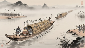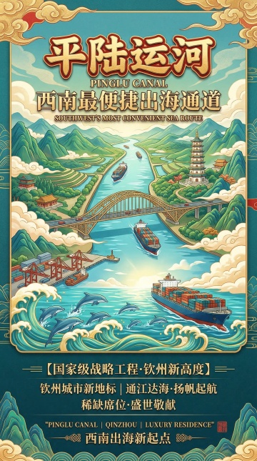 背景:靛蓝#1A365D(运河水面)+ 鎏金#DAA520(朝霞/皇家元素)渐变,模拟“清晨漕运启航”的光影氛围; 主体:赭石#8B5A2B(木质船体)+ 朱红#CD5C5C(龙舟装饰)+ 青绿#3CB371(两岸植被),体现盛唐的富丽与生机。 构图:全景式横向长卷(宽屏适配),画面中心为视觉焦点,向两侧延伸展现运河全貌: 中心(40%):隋炀帝龙舟(三层楼阁式,朱红#CD5C5C船身,鎏金#DA